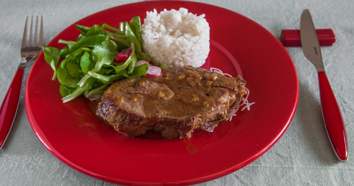Portion d'échine de porc fumé odika avec du riz, du manioc ou du tubercule